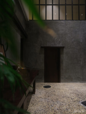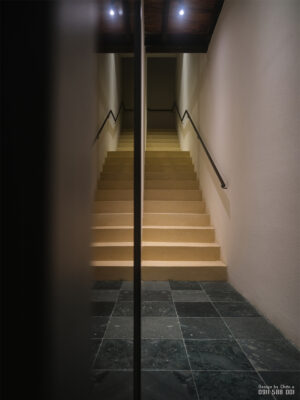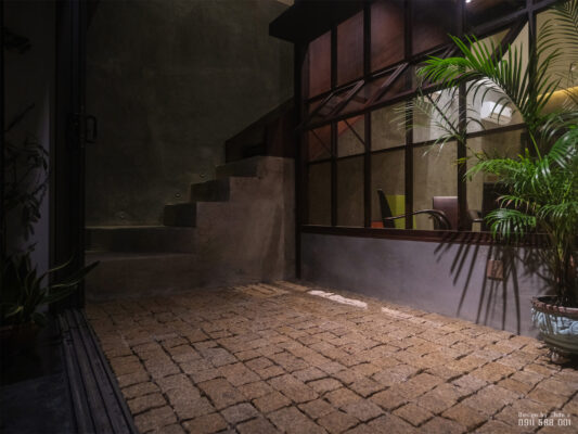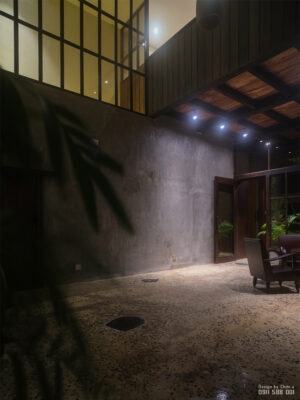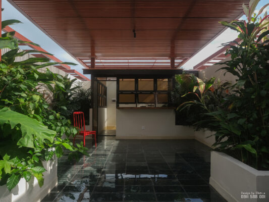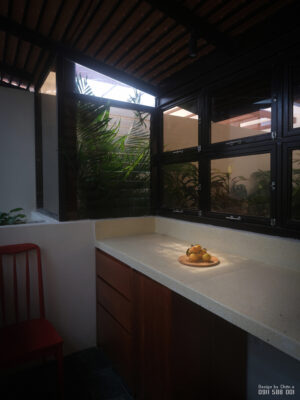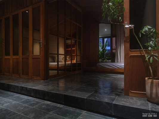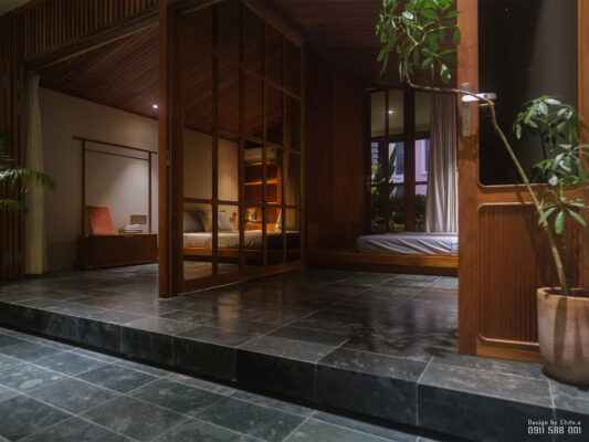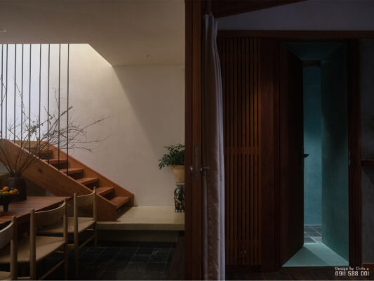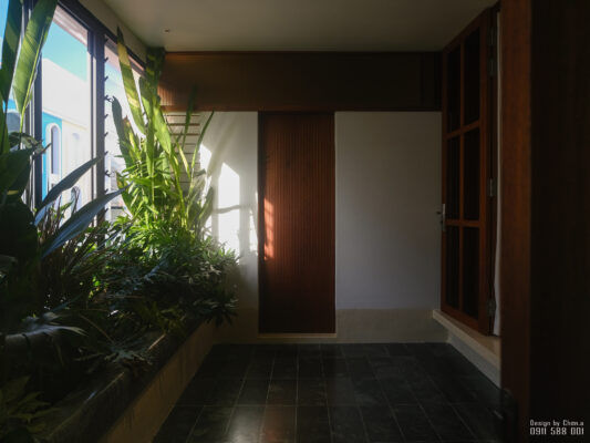 Cấu trúc khoảng hiên phía trước giữ vai trò như khoảng sân đệm với hương sắc cỏ cây tạo nên lớp không gian rỗng vừa che chắn nắng đầu chiều, vừa đủ ý nhị cho sự riêng tư của các phòng ngủ bên trong. Lớp sau cùng là trục cầu thang kết hợp cùng giếng trời, khoảng hiên, hành lang có vai trò đón nhận ánh sáng tự nhiên, đối lưu không khí và đón lấy gió mát hướng đông nam từ biển thổi vào. Thiên nhiên hiện hữu từ nền đá xanh, từ khung cửa gỗ, từ bậc thềm đá mài, từ mái ngói đất nung…cho đến hơi thở nồng nàn vị biển trong từng làn gió len qua khung cửa và chút cuối ngày nán lại đôi vệt nắng vàng mơ im lìm bên bậu cửa…chan hoà trong những xúc cảm rất đỗi an lành.